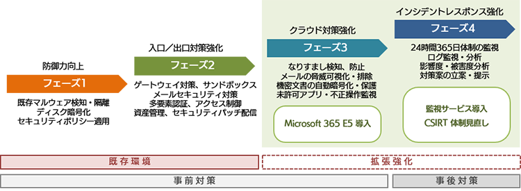 今回社内の情報システムを統括する IT企画部では、事業継続の観点からサイバー攻撃対策を進化させるため、Microsoft 365 E5 およびセキュリティの監視サービスであるマネージドセキュリティサービス(以下、MSS)を SBT の支援を受け、導入した。