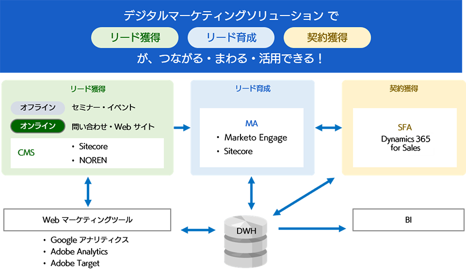 しかし、BtoB 企業のマーケティングにおいては、オンラインで収集できたデータを活用するだけでは完結しません。むしろ、オフラインデータ(イベント、セミナーで収集できる名刺情報・顧客属性、電話での問い合わせ、営業活動履歴など)と統合しなければ、新規見込み客獲得にも既存顧客へのリピートセル・クロスセルにも使えない、活用性の低い情報・データだけがあふれた、現実感のないマーケティング活動となってしまいます。