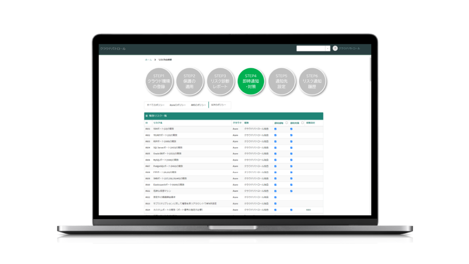 複数のパブリッククラウドをクラウドパトロール上で一元管理し、リスクを可視化します。1つの画面上で管理することで、煩雑な管理から脱却することができます。