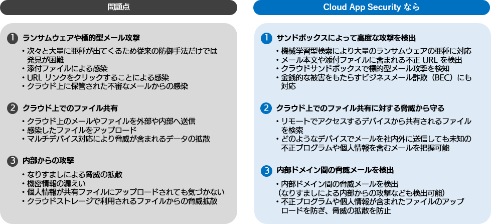 一方、ビジネスメール詐欺(BEC)、標的型メール攻撃、ランサムウェア、フィッシングメールなど Office 365 をすり抜けてしまう高度な脅威からデバイスを守ることが難しくなってきており、ユーザーの利用状況の把握も困難になっています。Office 365 は標準でセキュリティ機能を搭載していますが、今日の巧妙化した攻撃においては高度な検知技術が必要です。