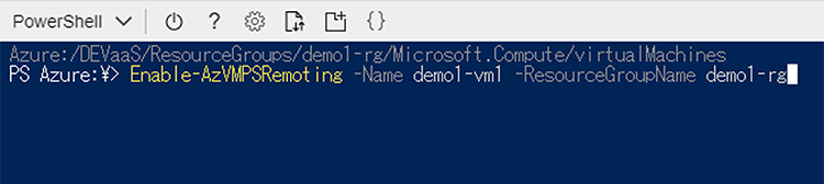 まず、Azure Cloud Shell のプロンプトに以下のコマンドを入力します。このコマンドで仮想マシンのリモート PowerShell を有効化しています。