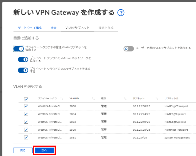オンプレミス環境からアクセスできるプライベートクラウド上の VLAN を選択します。