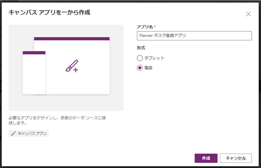 ※本ブログ記事ではアプリ名を「Planner タスク登録アプリ」、スマートフォンでも利⽤できるように形式を「電話」として作成を進めていきます。