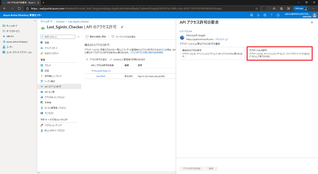 今回はアプリケーションとして最終サインイン日時を読み取るだけなので、"アクセスの許可の種類" が「アプリケーション」、 "アクセスの許可" が「User.Read.All」になります。