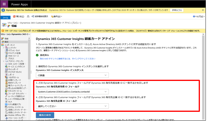 表示する Customer Insights のインスタンスの選択、Dynamics の ID フィールドと Customer Insights の顧客プロファイル ID のマッピングを行います。