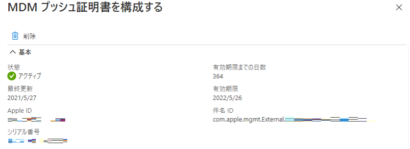 Intune で iOS/iPadOS、および macOS デバイスを管理するには、Apple MDM プッシュ通知証明書が必要となりますので、登録作業を実施する必要があります。