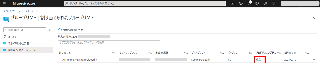 割り当てられたブループリント画面で、デプロイの状況が確認できます。デプロイが完了すると、プロビジョニング状態が「成功」と表示されます。