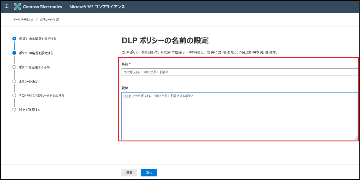 [DLP ポリシーの名前の設定] 画面に遷移後、[名前]、[説明] を入力して [次へ] をクリックします。