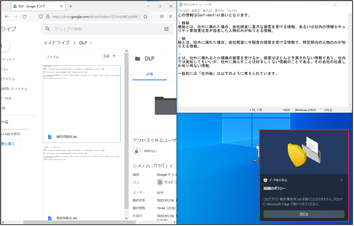 まず、Google Drive にサインインした上で、「Confidential」が含まれるファイルをアップロードしてみます。「保護されていないコンテンツのドラッグ アンド ドロップは、組織によってブロックされています。」と表示されていることが確認できました。