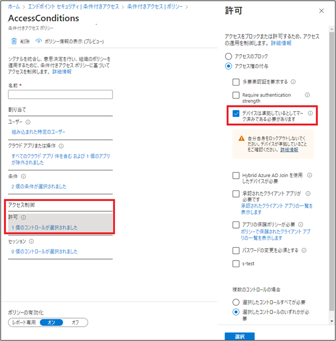 Azure AD 条件付きアクセスにて、デバイスが準拠している場合にのみアクセスを許可するポリシーを作成します。