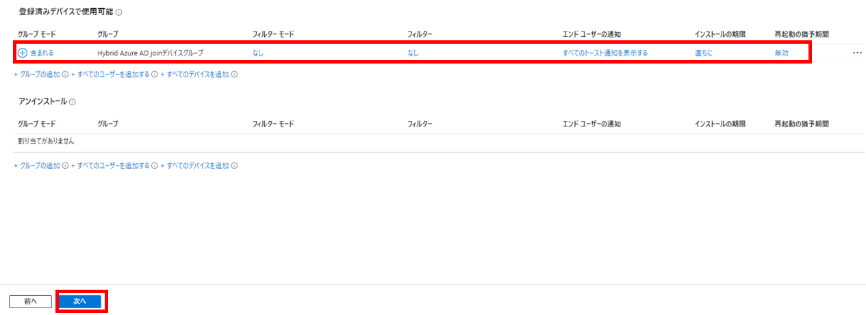 割り当ての種類として、今回は「登録済みデバイスで使用可能」を選択しましたが、他には「必須」、「アンインストール」を選択することが可能です。