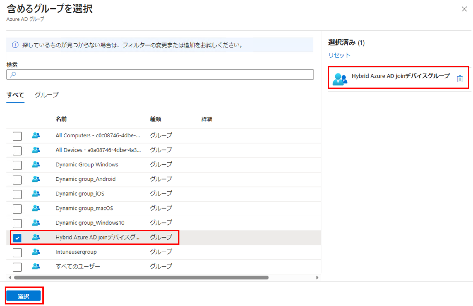レジストリ情報を確認したいグループ (デバイス、もしくはユーザーグループ) を選択して、 [選択] をクリックします。