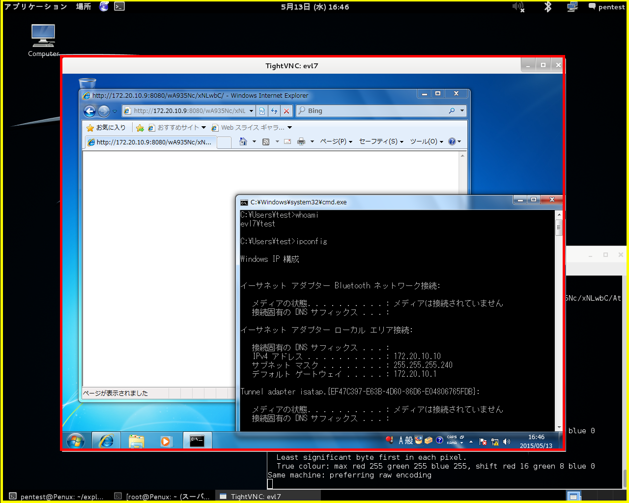 一方で、赤線で囲まれている部分は、ターゲットシステム(Windows 7)において、ホスト名、ユーザーの情報、IP アドレスの情報を表示するコマンドを実行した結果が表示されています。