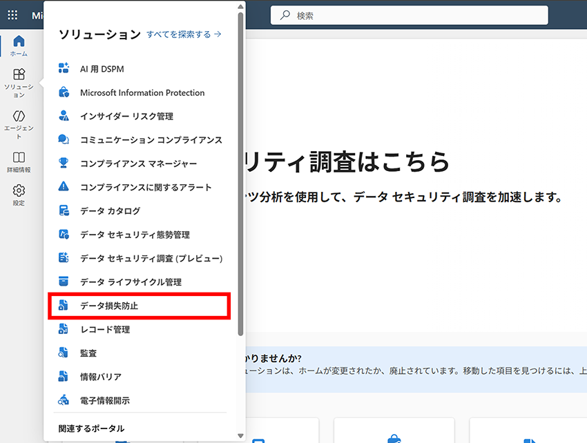 2. [ソリューション] - [データ損失防止] をクリックします。