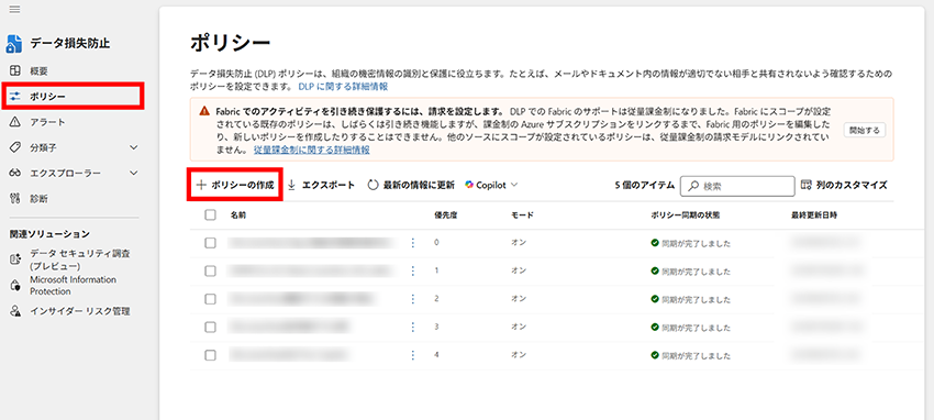 3. [データ損失防止] - [ポリシー] - [+ ポリシーの作成] をクリックします。