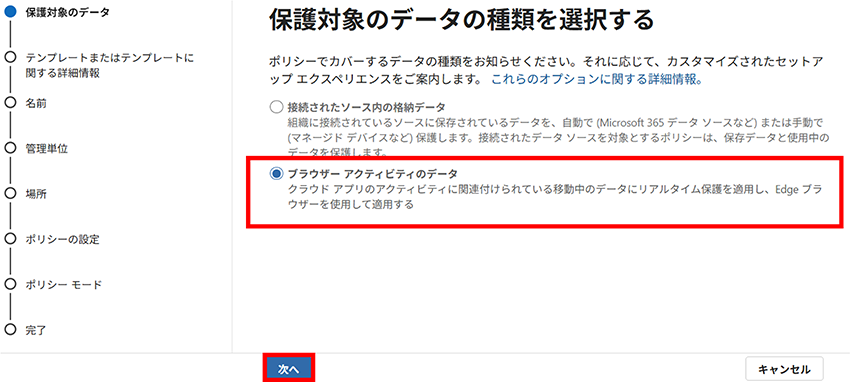 4. [ブラウザー アクティビティ内のデータ] を選択し、[次へ] をクリックします。