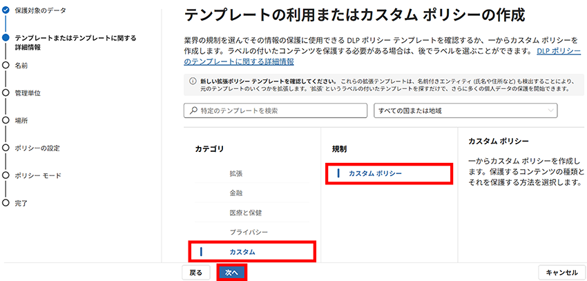5. [カテゴリ] ボックスの一覧から [カスタム] を選択し、[規制] の一覧から [カスタム ポリシー] を選択し、[次へ]をクリックします。