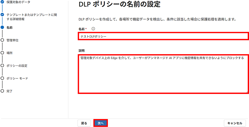 6. ポリシー名と任意で説明を入力し、[次へ]をクリックします。