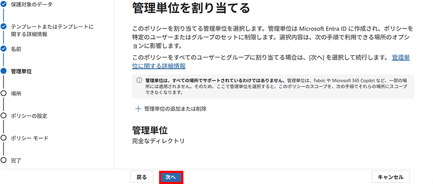 7. 既定の [完全なディレクトリ] を [管理単位の割り当て] はそのままの設定で [次へ]をクリックします