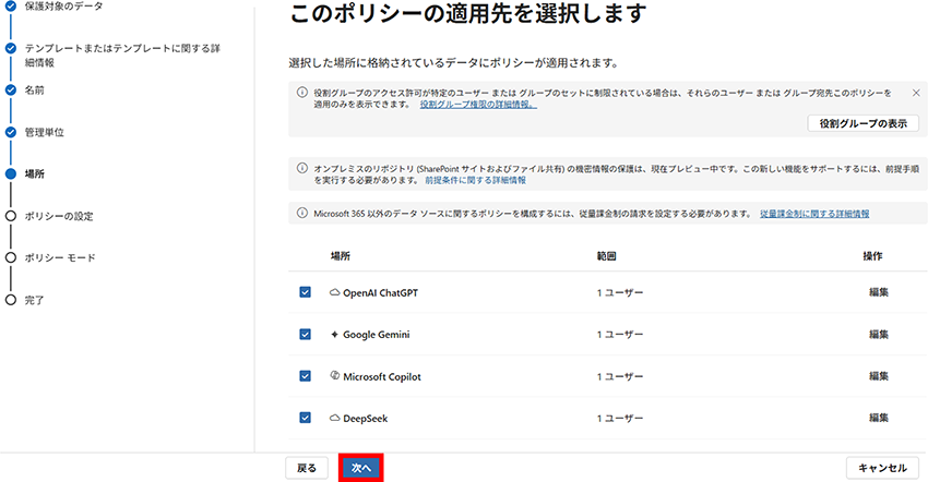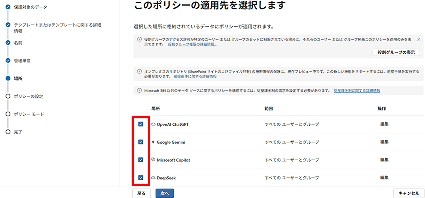 - プレビュー機能なので、アンマネージドクラウドAIアプリ(OpenAI ChatGPT、Google Gemini、DeepSeek、Microsoft Copilot(非Enterprise版)) への「テキストのアップロード」のみ監査/ブロックの制御を構成することが可能です。