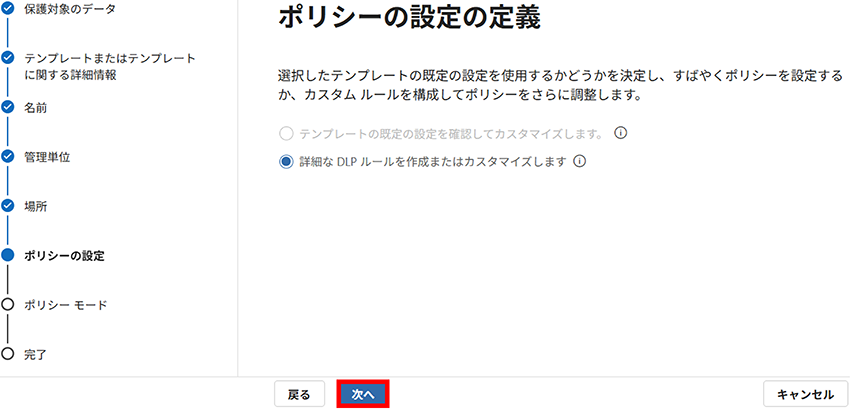 14. [ポリシー設定の定義] ページで、[詳細な DLP ルールを作成またはカスタマイズする] オプションが既に選択されているので、[次へ] をクリックします。