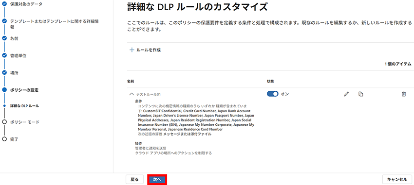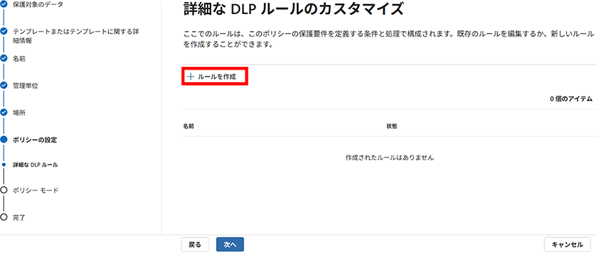 15. [詳細な DLP ルールのカスタマイズ] ページで、[+ ルールの作成] を選択します。