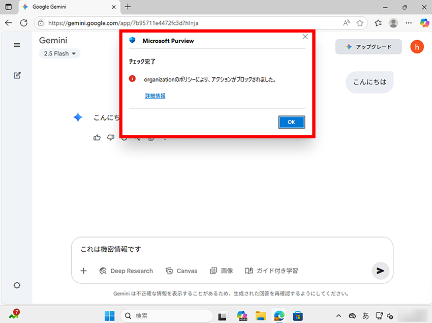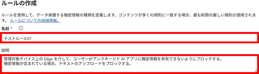 - アンマネージドクラウドAIアプリに送信するプロンプトテキストに機密情報が含まれていないことを検知可能なので、機密情報が誤って外部AIに送信されるのを防ぐことが可能である。
