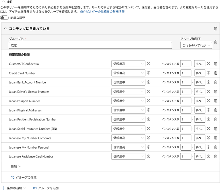 条件の追加 | グループ名 - グループ演算子 | 機密情報の種類 |