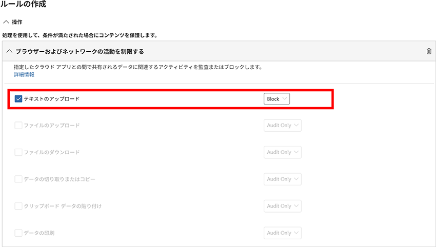ブラウザーおよびネットワークの活動を制限する | テキストのアップロード | 監査のみ/ブロック |