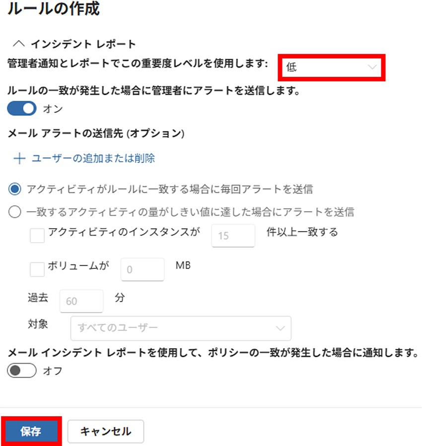 管理者のアラートとレポートでこの重大度レベルを使用する | 低 |