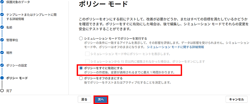 21. [ポリシー モード ] ページで、[ポリシーをすぐに有効にする] を選択し、[次へ] をクリックします。