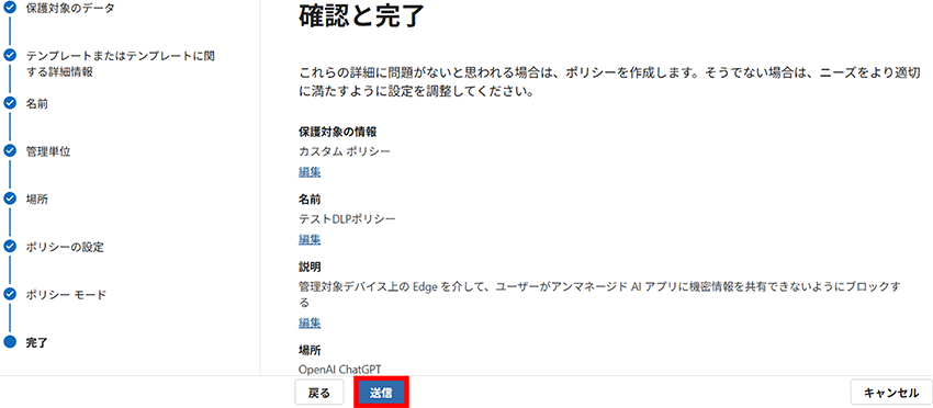 ここまで、Microsoft Edge 経由でアンマネージドクラウドAIアプリに機密情報を共有されないようにするDLPポリシーを検証しました。