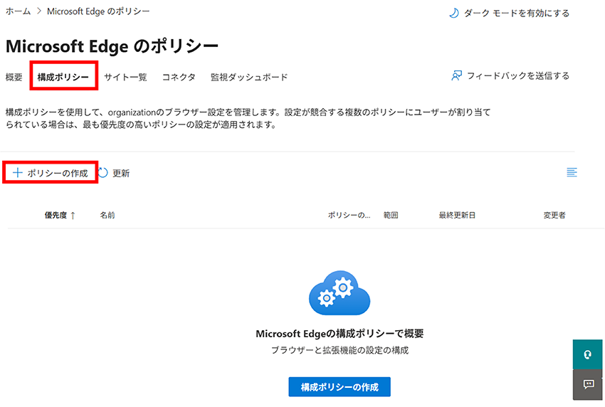 4. [構成ポリシー] のタブを開き、[+ポリシーの作成] をクリックします。