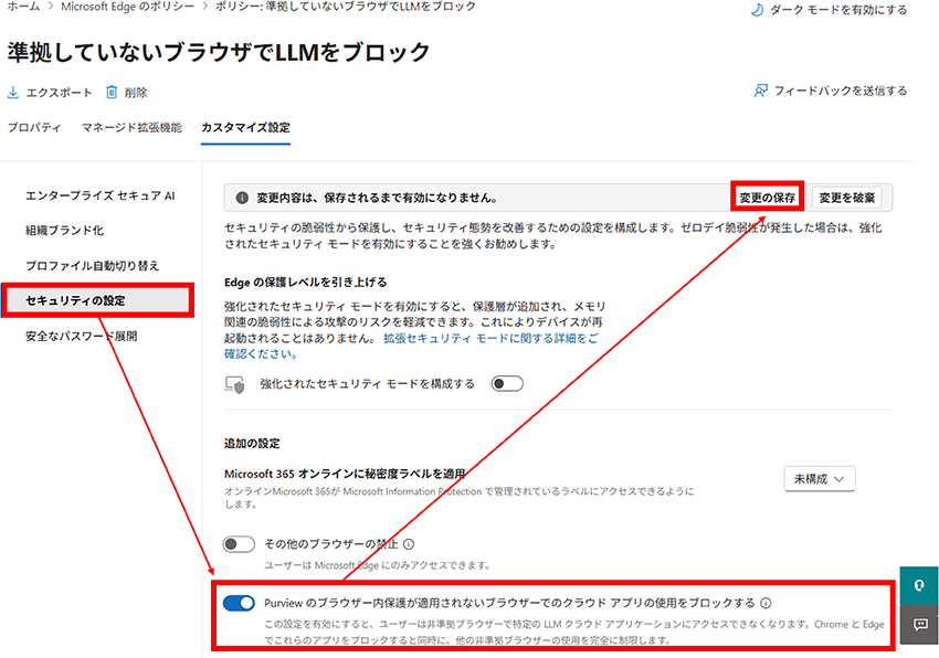 8. [セキュリティの設定] を開き、[Purview のブラウザー内保護が適用されないブラウザーでのクラウド アプリの使用をブロックする] を有効にし、[変更の保存] をクリックします。