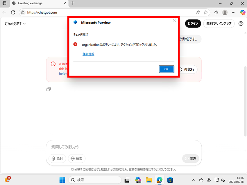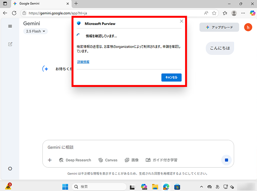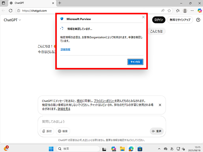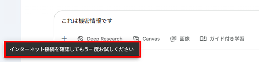 - プロンプトを入力する度にプロンプトテキストの内容を確認するポップアップが表示されるため、ユーザーは機密情報を含めないようにすることの重要性を自然と意識しやすくなる。