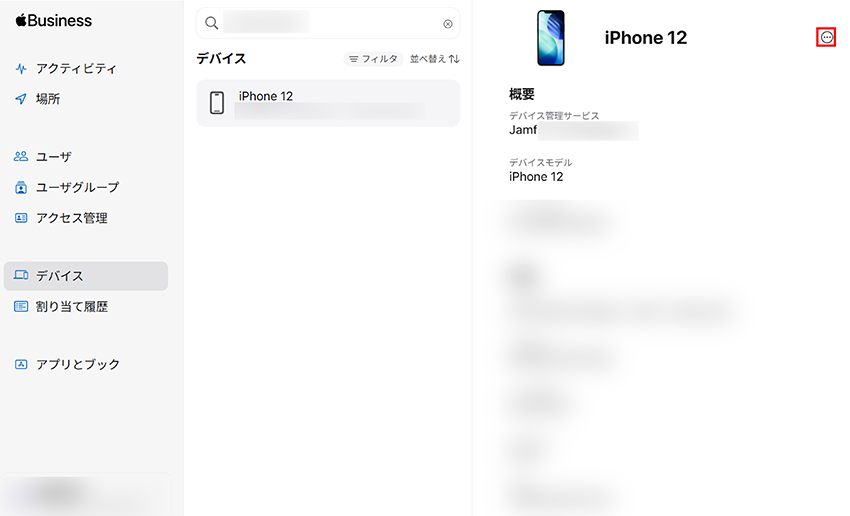 1.ABMの [デバイス] より、iOS 26, iPadOS 26, macOS 26以降を搭載したデバイスを選択して [・・・] をクリックします。