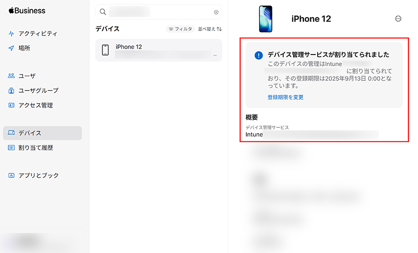 7. ABM上で該当のデバイスを確認すると、デバイス管理サービスが割り当てられた旨が表示され、デバイス管理サービスが Intune に変わっていることが確認できます。