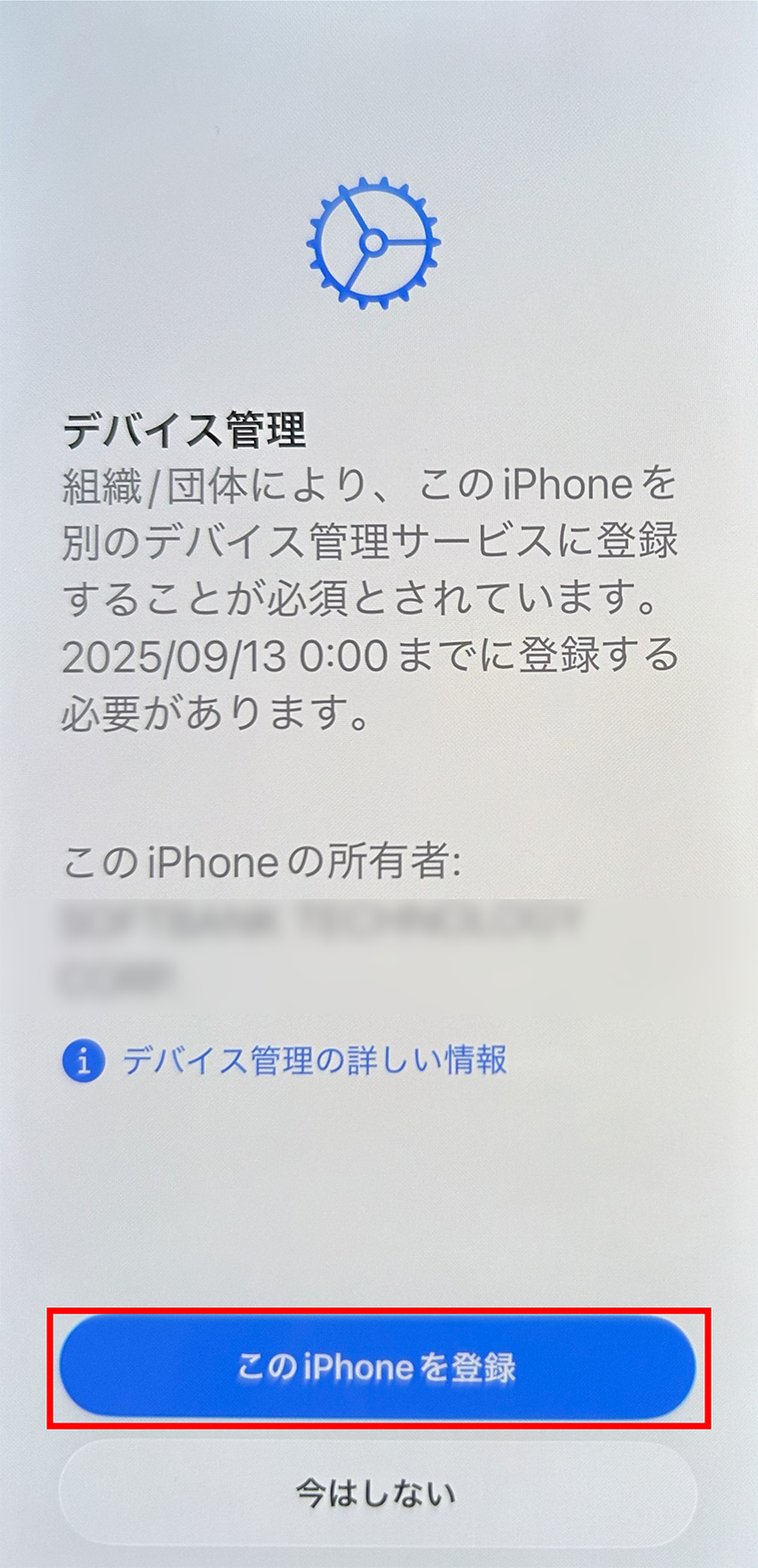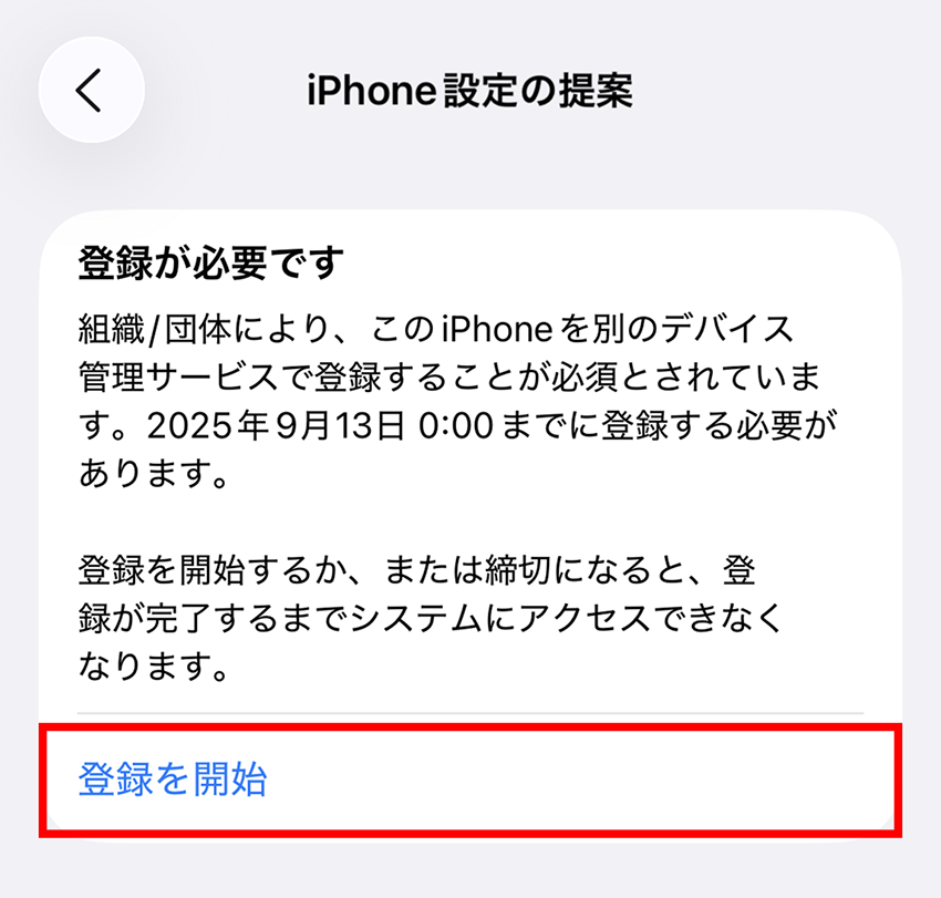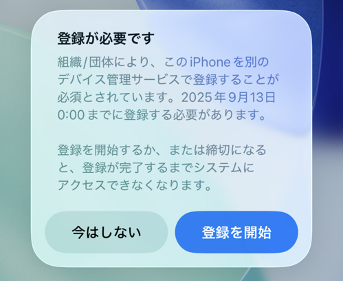 ※iOS 26より古いデバイスの場合、以下の表示となり登録期限の設定ができず、初期化不要のMDM移行機能を利用することができません。