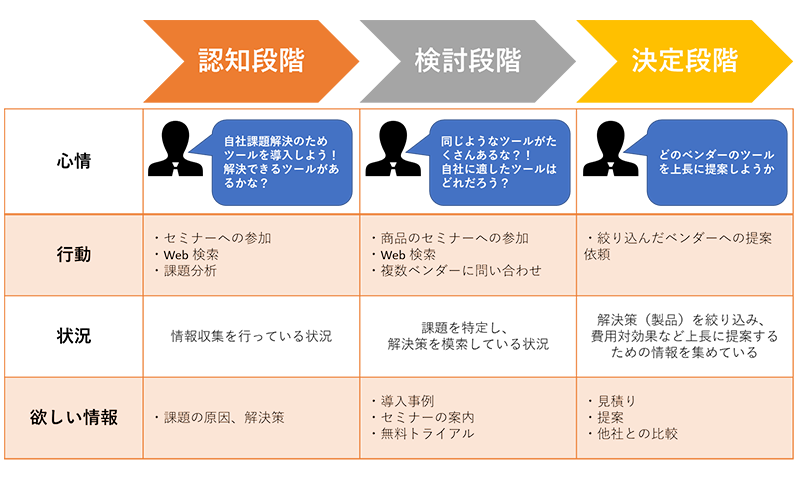 一般的に顧客ステージは「認知」「検討」「決定」の3つのステージから成り立ちます。