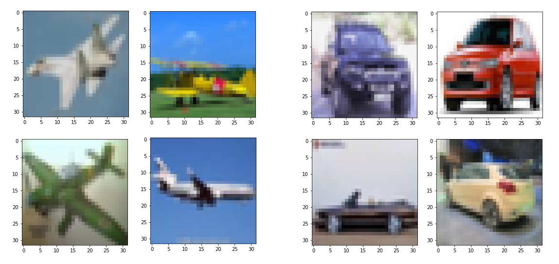 ここからは実際にデータを用いて機械学習モデルの学習と評価を行い、 ROC 曲線を描いてみたいと思います。画像の機械学習分野で非常に有名な CIFAR-10 というデータセットを使用します。 CIFAR-10 は飛行機や自動車、鳥など 10 種類のカテゴリの写真で構成されたデータセットです。カテゴリ毎に学習データ用として 5,000 枚、評価データ用として 1,000 枚の画像が含まれます。ここまで Positive と Negative の 2 値分類について説明してきましたので、このデータセットから飛行機と自動車の 2 つのカテゴリのみを抜き出し、飛行機を Positive 、自動車を Negative とした 2値分類のモデルを構築することにします。そのため学習用データは 10,000 枚、評価用データは 2,000 枚となります。例として、飛行機と自動車のカテゴリから 4 枚ずつ抜き出した画像を下図に示します。