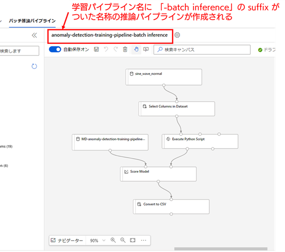 今回、トレーニング パイプライン ドラフトの名称を「anomaly-detection-training-pipeline」としたため、推論パイプライン ドラフトの名称にも「training」が入ってしまっています。これは少々紛らわしいので、以降は名称を「anomaly-detection-pipeline-batch inference」に変更したとして説明していきます。名称の変更方法は、トレーニング パイプライン ドラフトと同じです。