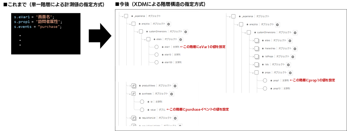 Web SDK から導入された、XDM ( eXperience Data Model ) というスキーマ(データ構造)に沿って、計測値を設定していくことになります。