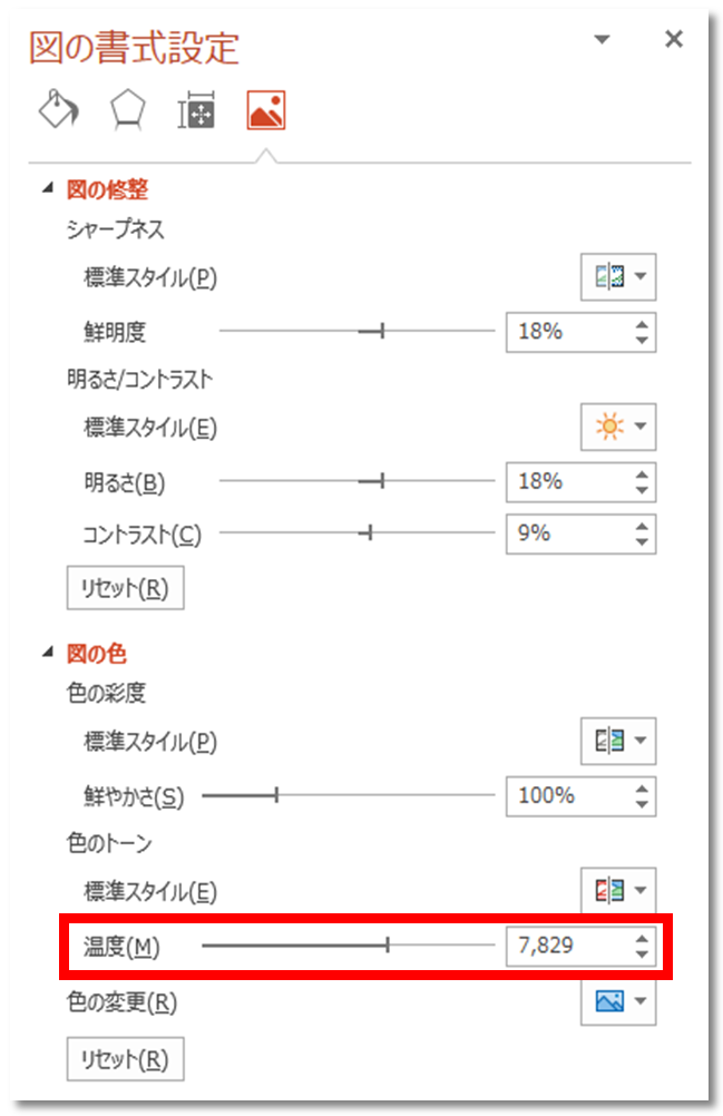 先ほどの例では明るさやコントラストをメインに調整しましたが、今度は「図の色」カテゴリにある「色のトーン>温度」を使用します。初期設定では「温度」は6,500になっていますが、この数値を大きくすると赤味がかり、小さくすると青味がかった画像になります。