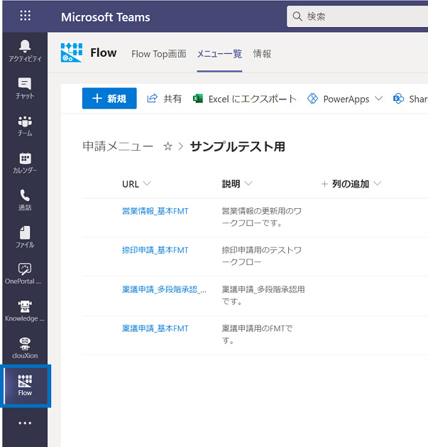 Flow」では、申請したワークフローが Exchange Online、Teams 通知の双方に対応しているため、申請があった場合の承認依頼の連絡を Teams と Outlook、双方で受信することができます。また、以下の画像のように Teams アプリにピン留めを行い専用メニュー画面を表示させることができるため、ワークフローの申請もすぐに行うことが可能です。
