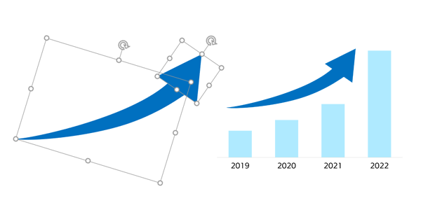 ビジネスプランや業績発表の資料作成を行うとき、グラフとあわせて「上向きになっている矢印(上昇矢印)」が欲しいという依頼がよくあります。 グラフだけでも数値の上昇は分かりますが、矢印が添えられている方が話し手の考えがより直感的に伝わることでしょう。また、通常の矢印より上昇矢印のほうが、「数値・増加率...