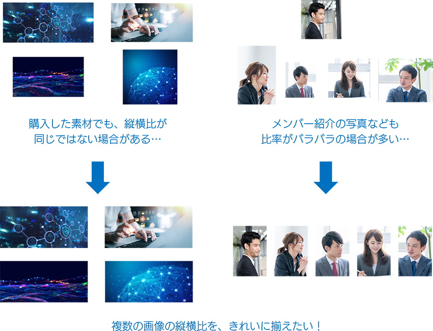 しかし、そのような場合はむしろまれで、同じストックフォトサイトで購入した写真であっても縦横比がそろっているとは限りませんし、社内で撮影した写真で比率がそろっていないこともあるでしょう。