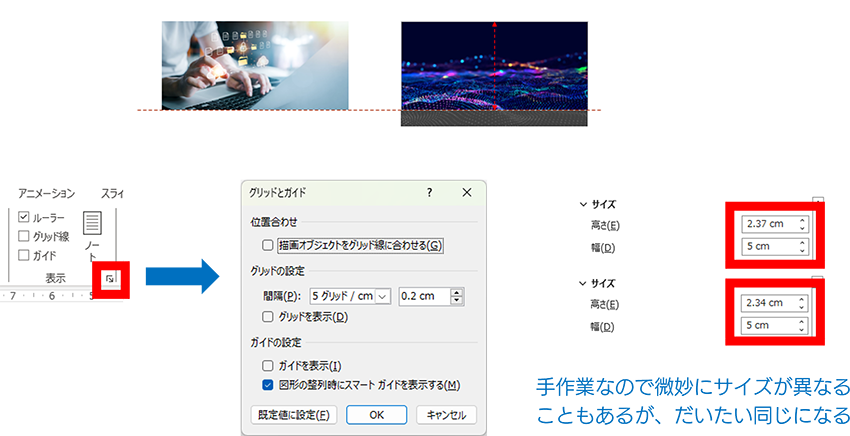 例えば全ての画像の横幅だけ数値入力でそろえておき(図の書式設定>サイズ>幅)、高さをスマートガイドを使用して調整する方法があるでしょう。トリミングツールをクリックして高さを調整するとき、同じサイズになったところで赤い点線が表示されるので、そこでトリミングを行うと高さをそろえることができます。もしスマートガイドが表示されていない場合は、表示タブの「表示」オプションをクリックし、「図形の整列時にスマートガイドを表示する」をオンにしてください。