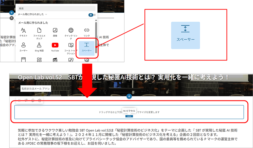 とはいえ、あまりスペースがなさすぎてもギチギチで見栄えが悪くなるだけではなく、読み手に“読みづらい”という印象を与えてしまうおそれも・・・。そうならないために当社ではStyleExtension For Compactでスペースを0にしたうえで、SharePoint の標準Webパーツ「スペーサー」を使用しています。Webパーツ「スペーサー」は、テキストとテキストの間や画像とテキストの間などにスペースを入れることができるWebパーツで、スペースのサイズも自由に調整することが可能です。